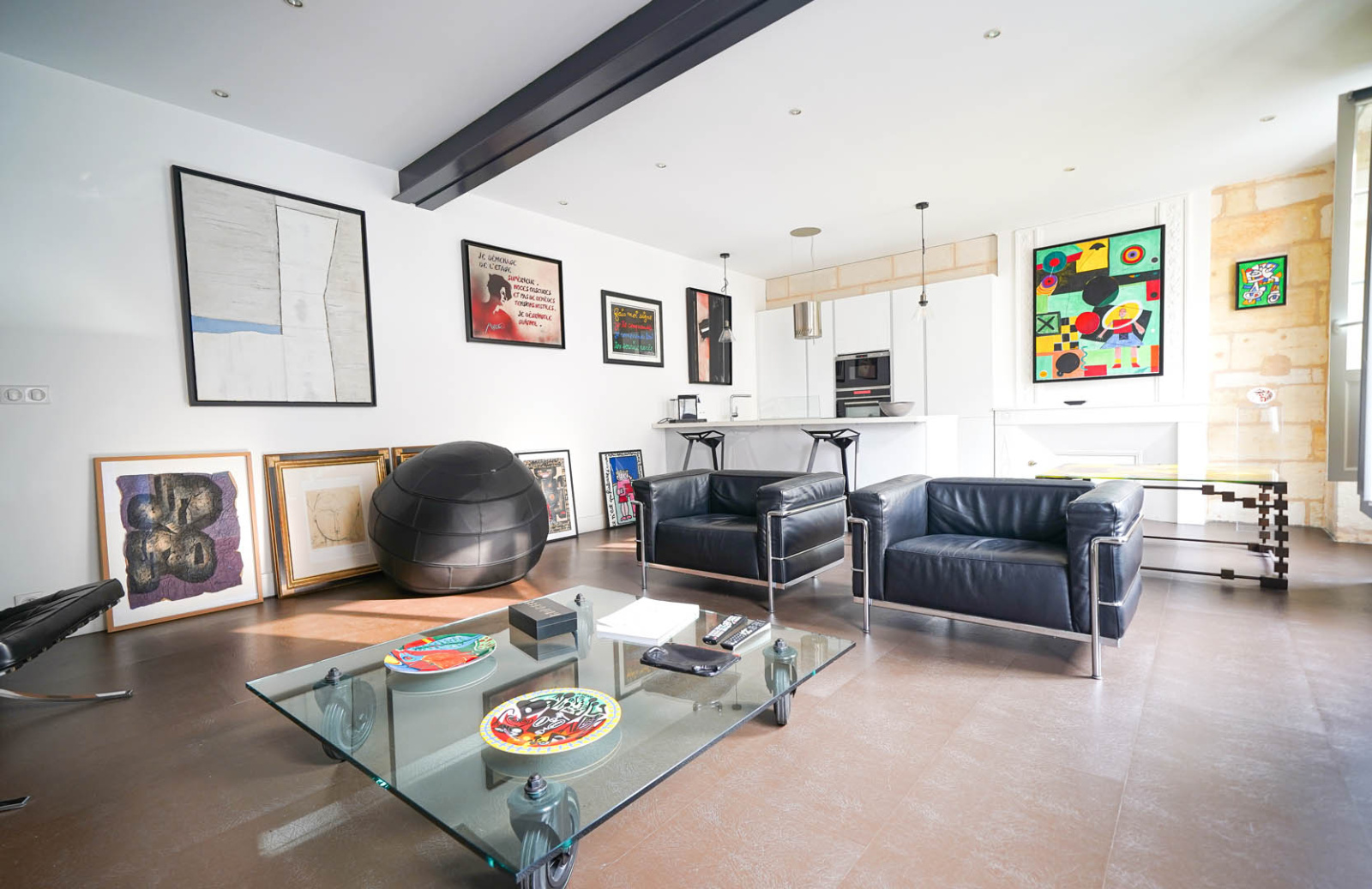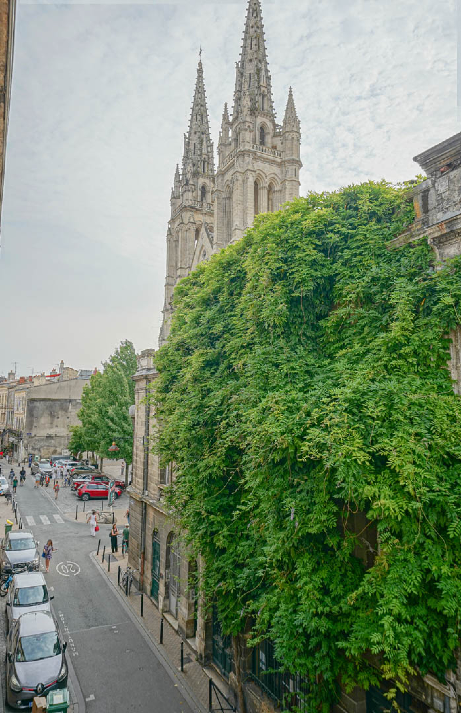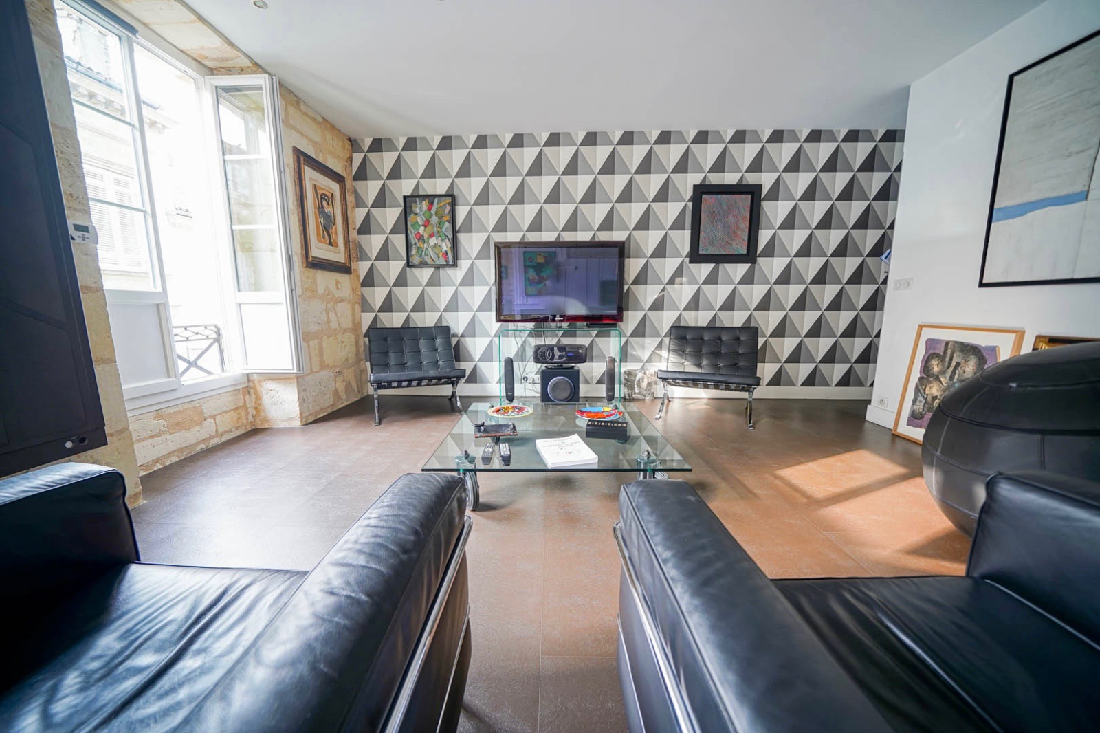 Dans la pièce de vie, les trois portes fenêtres en enfilade, vous donnent l'impression d'être à la fois à l'intérieur et à l'extérieur, avec une vue dégagée sur l'église Notre Dame.